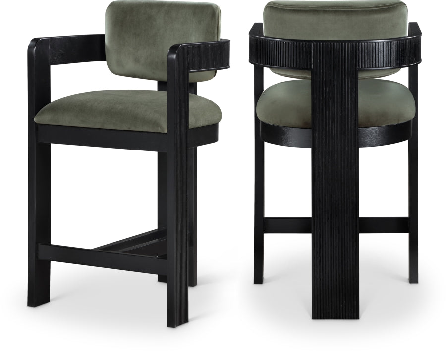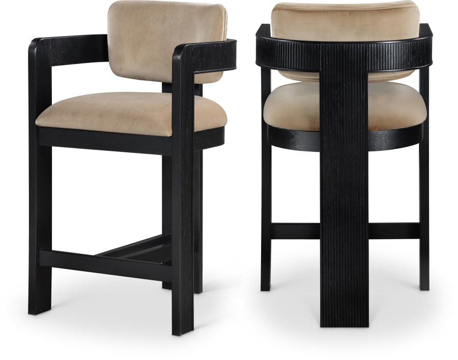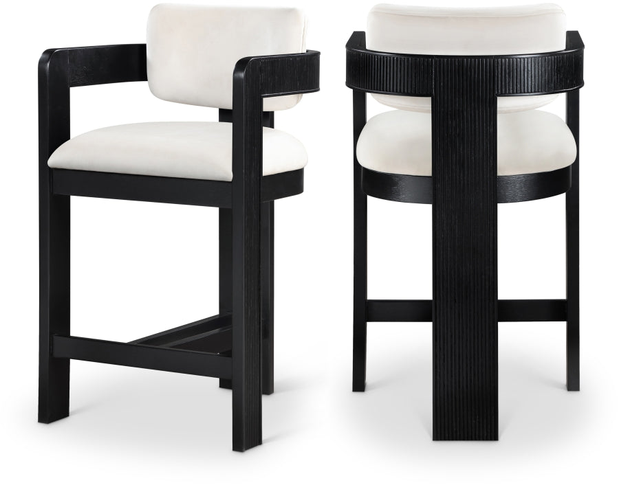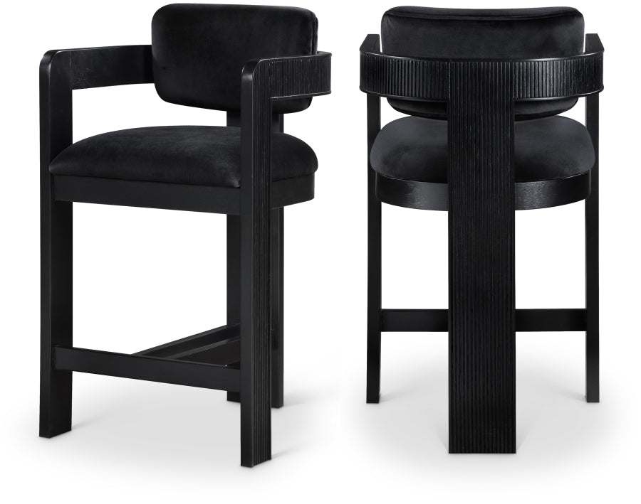 Elevate your counter seating with the Sasha velvet upholstered counter stool, a perfect blend of refined texture and timeless craftsmanship. Wrapped in a soft, striking 460 GSM velvet, this stool offers both depth and sophistication. The solid wood frame, finished in a black tone, showcases elegant fluted detailing, adding a touch of classic artistry.